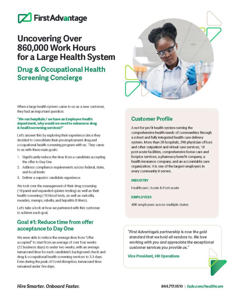 A large not-for-profit health system with over 40,000 employees across multiple states was looking to consolidate their pre-employment drug and occupational health screening program. This case study dives into how they reduced their onboarding time, addressed compliance requirements, and delivered a positive candidate experience.