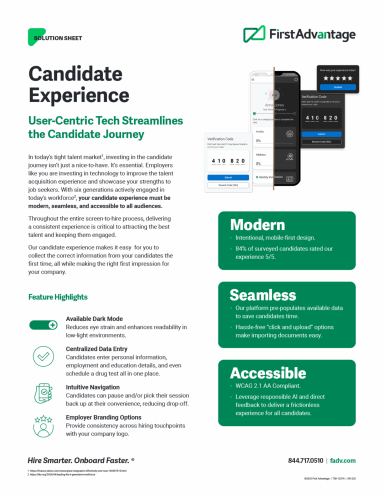 Our intuitive, accessible candidate experience makes it easy for you to seamlessly collect the correct information from your candidates the first time, all while making the right first impression. No matter where in the world your candidate is located, they can submit their details quickly and easily, whenever is most convenient for them.